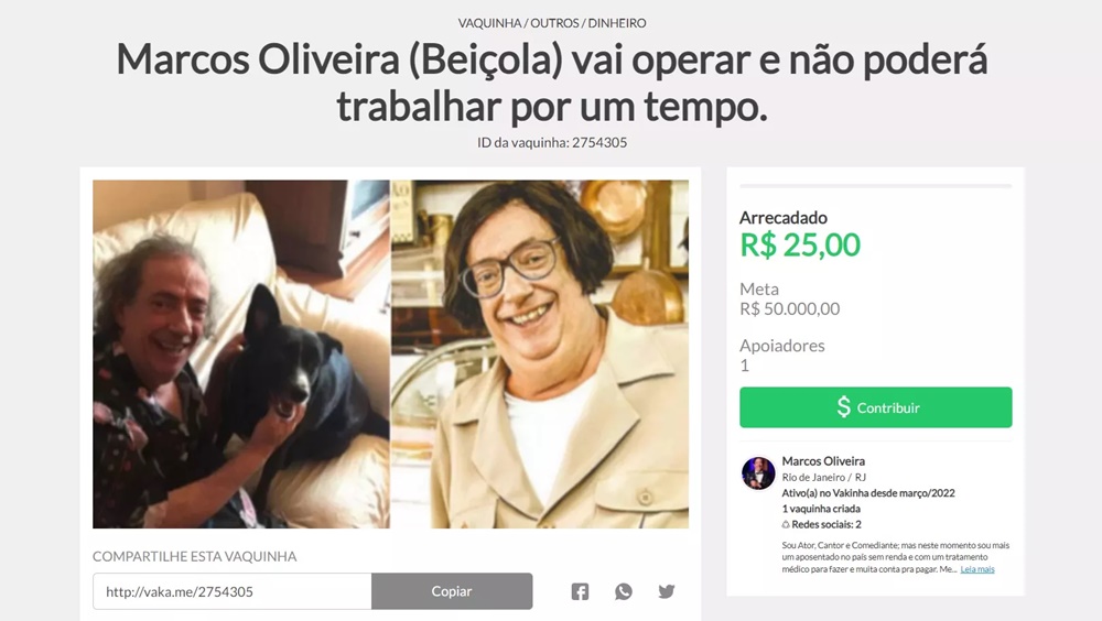 Marcos Oliveira, o Beiçola, de A Grande Família, resolveu pedir ajuda financeira para os fãs. O ator revelou que está desempregado desde que passou por uma cirurgia que o deixou impossibilitado de atuar. Ele publicou um texto em sua página pessoal no Facebook, informando aos seguidores que fez uma vaquinha virtual para ajudar no pagamento de contas e outras necessidades pessoais. As informações são da revista Marie Clarie.