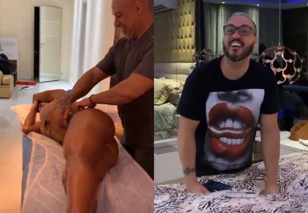 Nos registros, ela aparece de lingerie nude tendo suas curvas aos cuidados do massageador enquanto o maridão, o cantor Belo, na cama ao lado, bate um papo e até solta a voz enquanto a amada relaxa na maca.