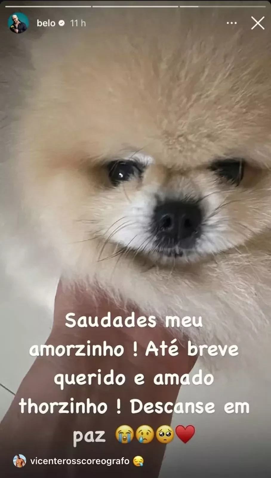 Belo usou as redes sociais para lamentar a morte de Thorzinho, um Lulu da Pomerânia que viveu com Gracyanne Barbosa após a separação do casal em abril de 2024. O cantor publicou uma homenagem ao animal, que faleceu na segunda-feira (6). “Saudades, meu amorzinho! Até breve, querido e amado Thorzinho. Descanse em paz”, escreveu ele.