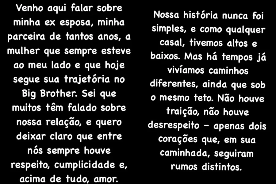 "Venho aqui falar sobre minha ex-esposa, minha parceira de tantos anos, a mulher que sempre esteve ao meu lado e que hoje segue sua trajetória no Big Brother. Sei que muitos têm falado sobre nossa relação, e quero deixar claro que entre nós sempre houve respeito, cumplicidade e, acima de tudo, amor."