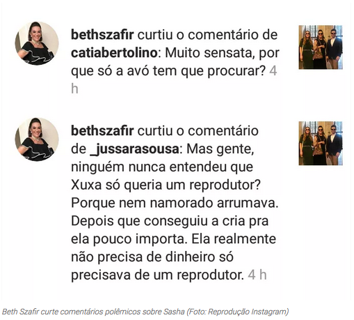Beth não costuma responder, mas vem curtindo vários deles. "Eu não suporto a Sasha, e vi que sempre estive certo. Nem a avó dela gosta dela. Realmente a Sasha coisa boa não é, minha intuição não engana", disse um seguidor e um dos comentários curtido por ela.