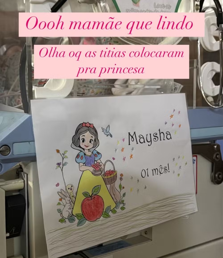 A influenciadora Bia Miranda, de 21 anos, usou suas redes sociais para celebrar neste domingo (25) o primeiro mês de vida da filha, Maysha, que nasceu no dia 23 de abril. A menina, que é fruto do relacionamento com o também influenciador Samuel Sant'Anna, conhecido como Gato Preto, está internada na UTI desde seu nascimento. No Instagram, Bia mostrou que ela ganhou uma decoração em sua incubadora: um desenho da princesa Branca de Neve.