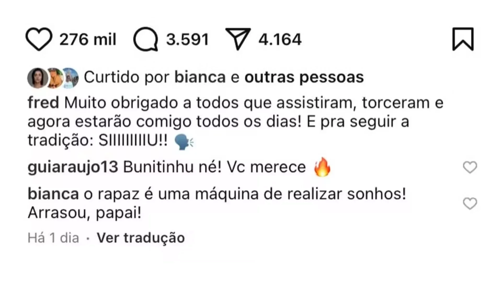Bianca Andrade, com 30 anos, fez elogios públicos ao ex-companheiro Fred Bruno, que tem 35. A empresária comentou em uma postagem no Instagram do jornalista na segunda-feira (13), mencionando sua estreia como apresentador do Globo Esporte de São Paulo. "O rapaz é uma máquina de realizar sonhos. Arrasou, papai", declarou Bianca, que é mãe de Cris, fruto de sua relação com o também ex-participante do Big Brother Brasil.