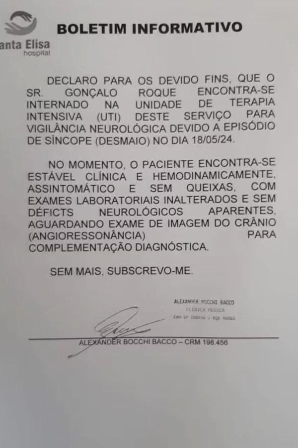 Na tarde desta segunda-feira (20), o Hospital Santa Elisa, em Jundiaí, no interior de São Paulo, divulgou boletim médico de Gonçalo Roque, animador e diretor de auditório do SBT. Ele está internado na Unidade de Terapia Intensiva (UTI) do hospital após passar mal no último sábado.