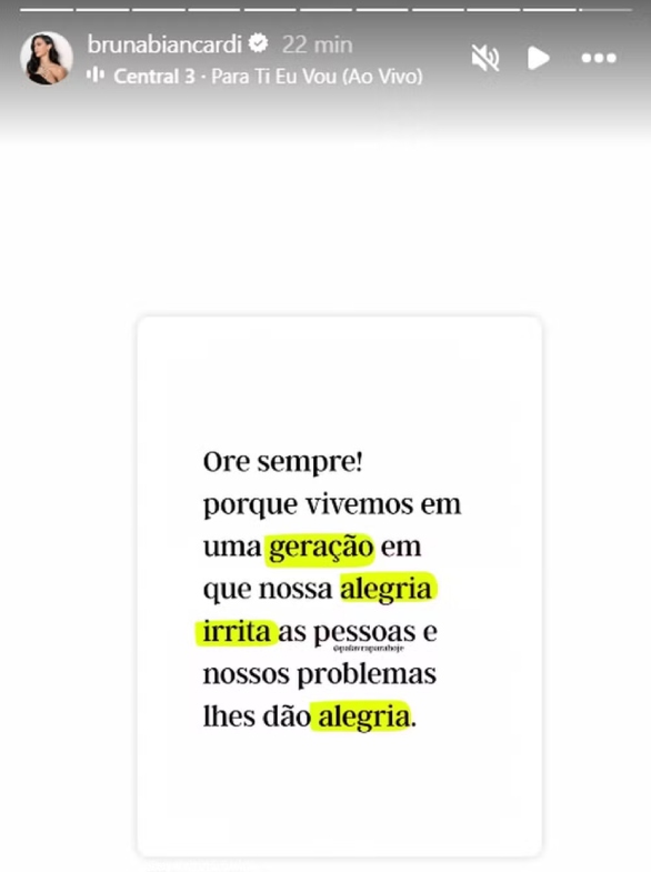 "Ore sempre! Porque vivemos em uma geração em que nossa alegria irrita as pessoas e nossos problemas lhes dão alegria", diz a mensagem que Bruna compartilhou nos stories.
