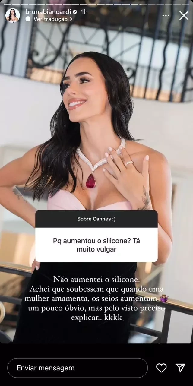 De viagem pela França para participar do Festival de Cinema de Cannes, Bruna Biancardi, 30 anos, abriu uma sessão de perguntas nas redes sociais para interagir com os seguidores. Além de responder às perguntas, a influenciadora também rebateu críticas que recebeu, incluindo comentários sobre seu corpo.