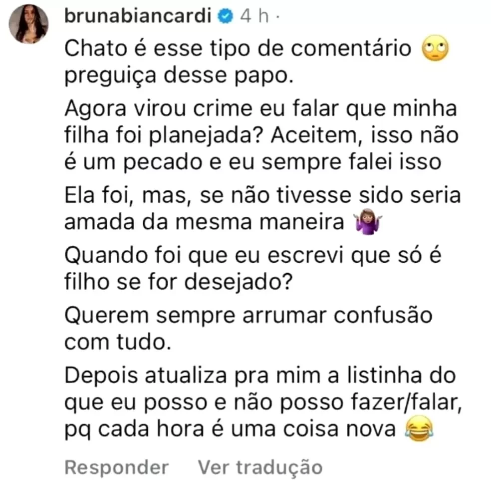“Chato é esse tipo de comentário, preguiça desse papo. Agora virou crime eu falar que minha filha foi planejada? Aceitem, isso não é pecado. Se não tivesse sido, seria amada da mesma maneira”.