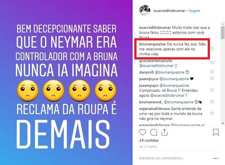 Após a repercussão da entrevista, um fã clube do ex-casal publicou uma imagem dizendo que estava decepcionada com Neymar por ele "ser controlador" e acrescentou que "reclamar da roupa é demais". Bruna logo comentou a publicação e disse: "Ele nunca fez isso. Não me relacionei apenas com ele na minha vida".