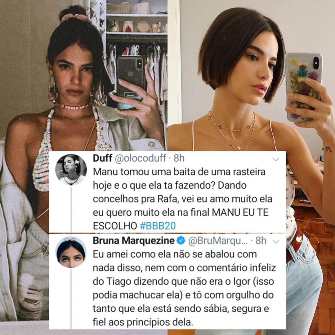 "Eu amo muito ela, eu quero muito ela na final. Manu eu te escolho", afirmou a seguidora. E Bruna Marquezine, que está de olho em tudo o que acontece no programa, respondeu, em apoio à amiga, deixando uma crítica para Tiago Leifert.