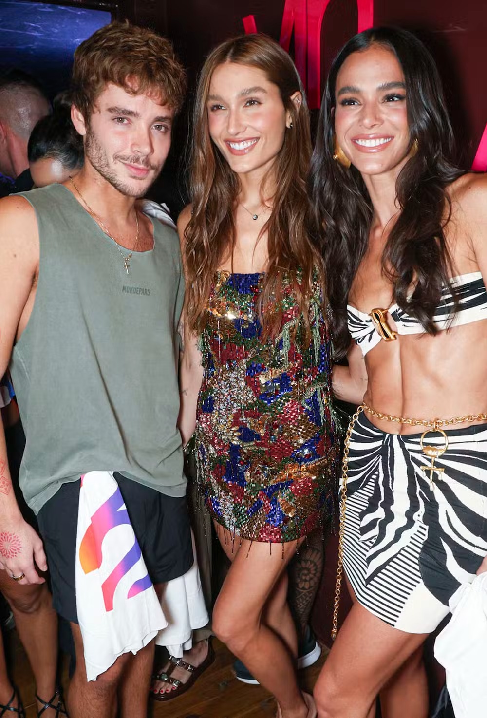 Para a noite de festa em Salvador, Bruna apostou em um conjunto de top e saia de tricô com efeito trompe l’oeil que remete a um pareô, finalizado com acessórios dourados de pegada surrealista. Já Sasha optou por um minivestido multicolorido, bordado à mão com miçangas e franjas, criando um visual com brilho e movimento inspirado em pedras preciosas.
