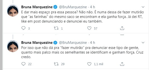 "E dar mais espaço pra essa pessoa? Não, não. É numa dessa de fazer mutirão que 'as farinhas' do mesmo saco se encontram e ela ganha força. Já dei RT, like em post denunciando e denunciei eu também. Por isso que não dá pra 'fazer mutirão' pra denunciar esse tipo de gente, quanto mais palco mais os semelhantes se identificam e ganham força. Cruz credo", afirma.