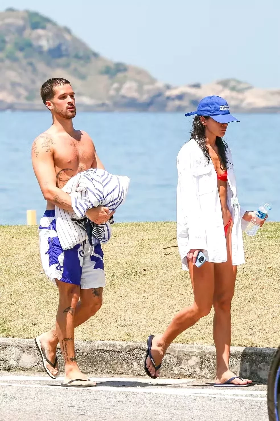 A influenciadora vestia um biquíni vermelho, complementado por uma camisa branca e um boné azul, enquanto João usava apenas uma bermuda de praia, exibindo suas várias tatuagens. O ator carregava as toalhas que o casal utilizou.