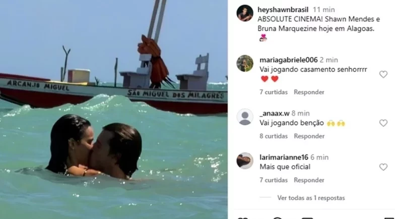 Na segunda-feira (29), Shawn Mendes foi visto mandando um beijo para Bruna durante uma partida de vôlei na praia. Já na terça-feira (30), os dois também foram flagrados trocando beijos em outro momento à beira-mar.