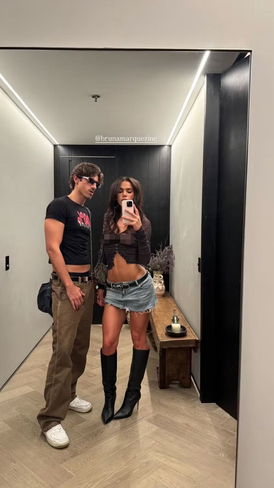 Bruna Marquezine, de 29 anos, esquentou a web ao surgir usando uma blusa transparente e uma minissaia para celebrar o aniversário de um amigo, Lucas Vianna, neste sábado (21). O look da atriz foi composto por uma saia jeans de cintura baixa, botas de salto e cano alto. A festa funk aconteceu no Centro do Rio.