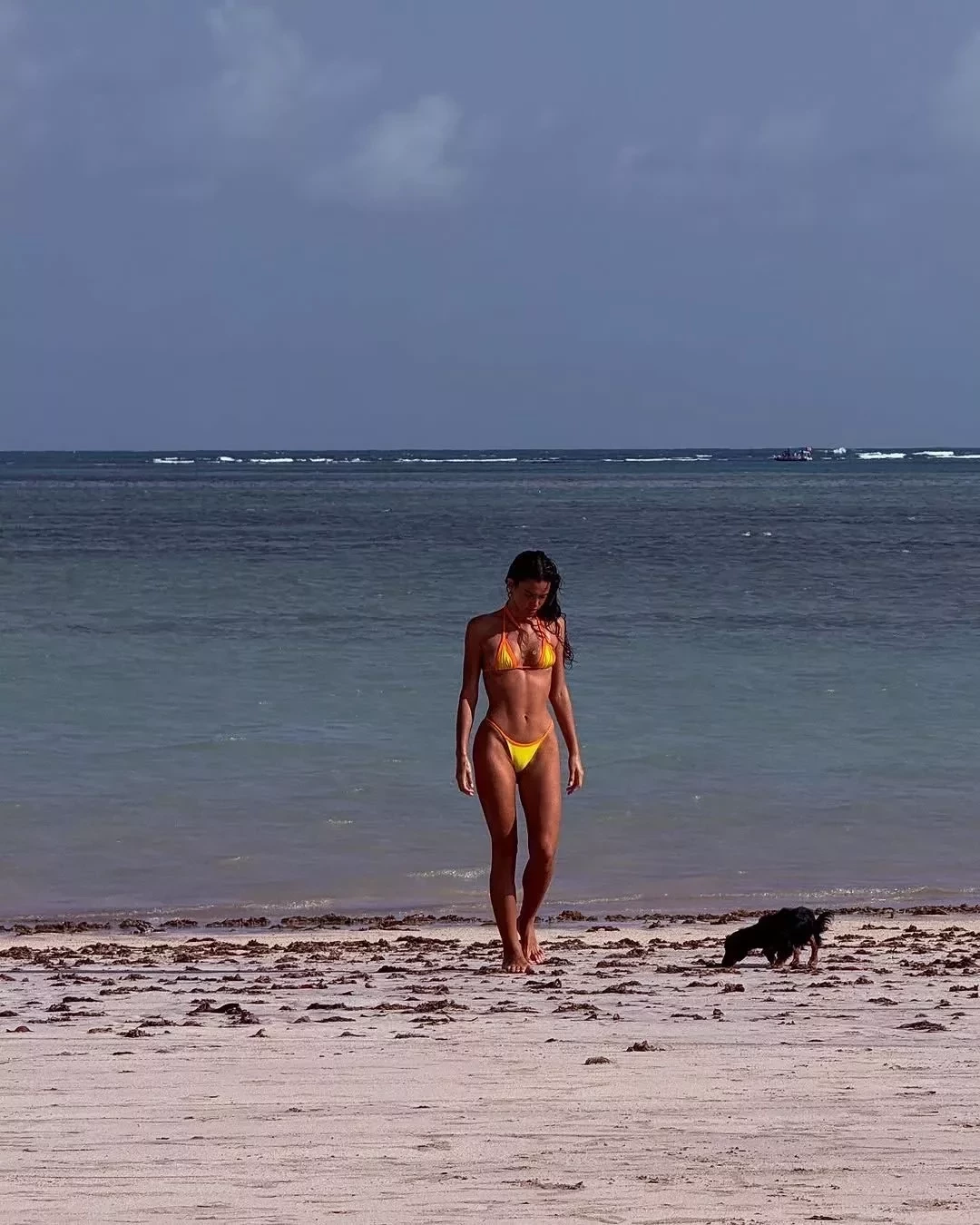 Bruna Marquezine compartilhou fotos de férias em Alagoas, exibindo seu corpo em biquíni fio-dental