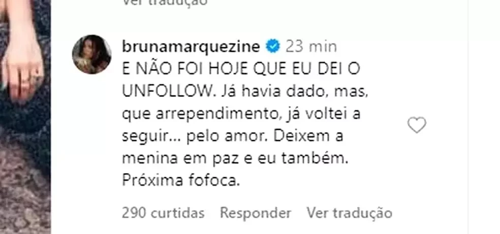 Após a repercussão, Bruna voltou a seguir Yasmin e comentou novamente: "E NÃO FOI HOJE QUE EU DEI UNFOLLOW. Já havia dado antes, mas me arrependi e já voltei a seguir... pelo amor. Deixem a menina em paz e eu também. Próxima fofoca."