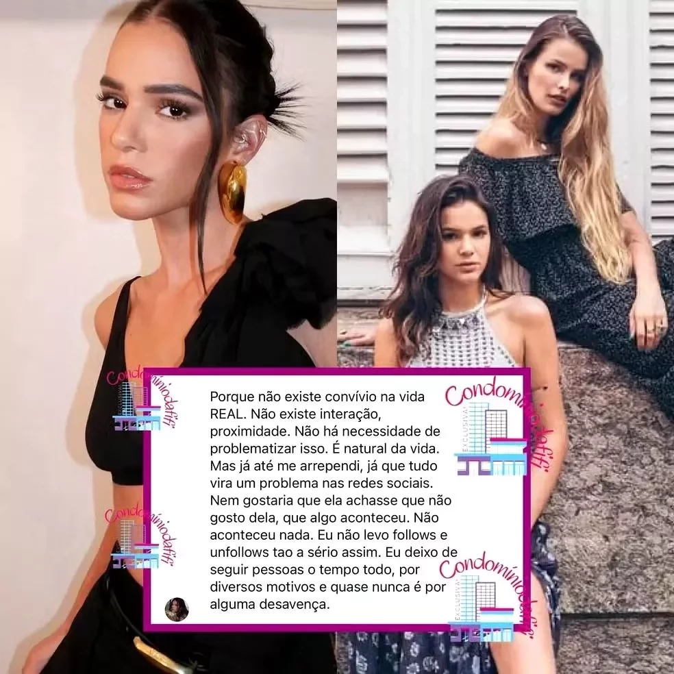 Após especulações geradas por deixar de seguir Yasmin Brunet no Instagram, Bruna Marquezine esclareceu a situação. Em resposta aos rumores de que o unfollow teria relação com seu namorado João Guilherme, a atriz negou qualquer conexão e explicou que a decisão não teve maiores significados.