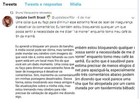 Após Bruna Marquezine suspender sua conta no Instagram, uma enxurrada de comentários cercaram o porquê da escola da atriz. Embora Marquezine não tenha se pronunciado diretamente sobre o caso, ela usou sua conta no twitter para republicar um desabafo de Taylor Swift que diz muito sobre a atitude da atriz.