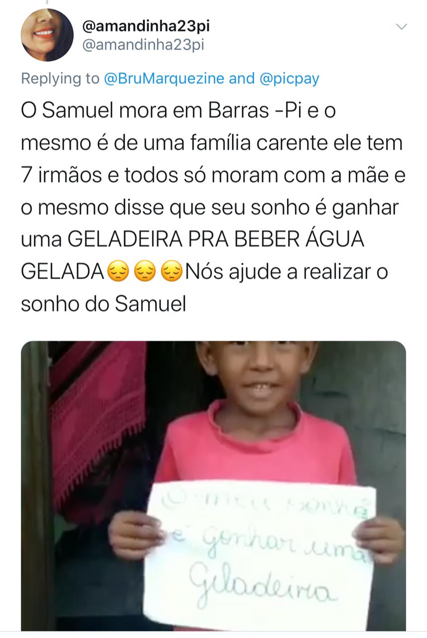 "O Samuel mora em Barras-PI e o mesmo é de uma família carente, ele tem 7 irmãos e todos só moram com a mãe e o mesmo disse que seu sonho é ganhar uma GELADEIRA PRA BEBER ÁGUA GELADA. Nós ajude a realizar o sonho do Samuel!", pediu a jovem Amanda que compartilhou a história de Samuel com vários famosos.