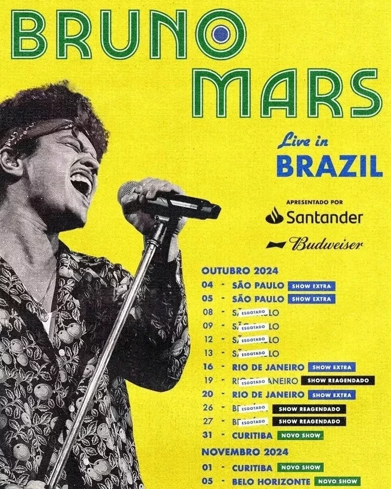 Bruno Mars segue levando os fãs à loucura! O artista confirmou mais sete shows no Brasil. Na tarde desta sexta-feira (17), a produtora responsável pela vinda do famoso, anunciou através de uma postagem no feed, apresentações extras em Curitiba, Belo Horizonte, Rio de Janeiro e São Paulo.