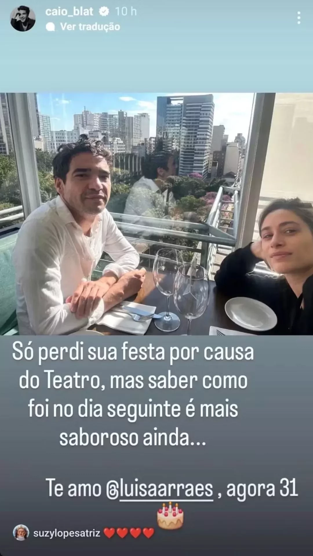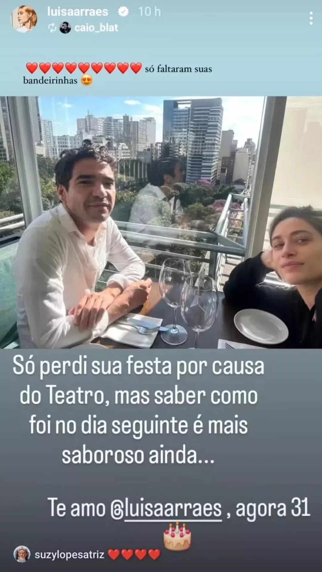 "Só perdi sua festa por causa do teatro, mas saber como foi no dia seguinte é mais saboroso ainda... Te amo, Luisa Arraes, agora 31", dizia o post de Blat. "Só faltaram suas bandeirinhas", respondeu Luisa ao compartilhar o post do marido.