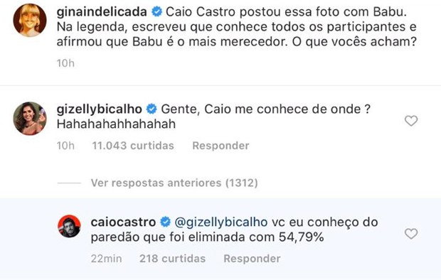 No Instagram, Gizelly chegou a perguntar, de forma bem-humorada: "gente, Caio me conhece de onde? Hahahahahaha". Ele, então, rebateu: "você eu conheço do paredão que foi eliminada com 54,79% dos votos".