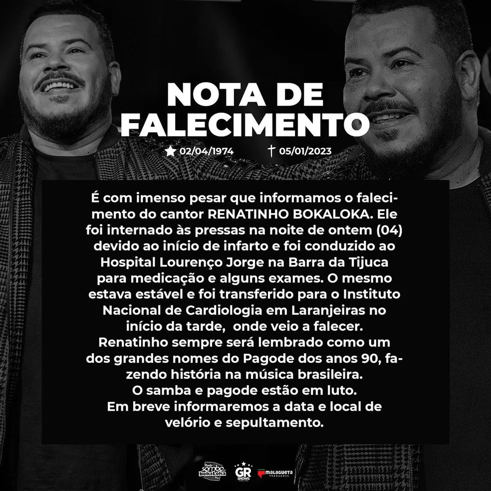 "É com imenso pesar que informamos o falecimento do cantor Renatinho Bokaloka. Ele foi internado às pressas na noite de ontem (04) devido ao início de infarto e foi conduzido ao Hospital Lourenço Jorge na Barra da Tijuca para medicação e alguns exames. O mesmo estava estável e foi transferido para o Instituto Nacional de Cardiologia em Laranjeiras no início da tarde, onde veio a falecer. Renatinho sempre será lembrado como um dos grandes nomes do Pagode dos anos 90, fazendo história na música brasileira. O samba e pagode está em luto. Em breve informaremos a data e local de velório e sepultamento", diz o comunicado enviado por sua equipe.