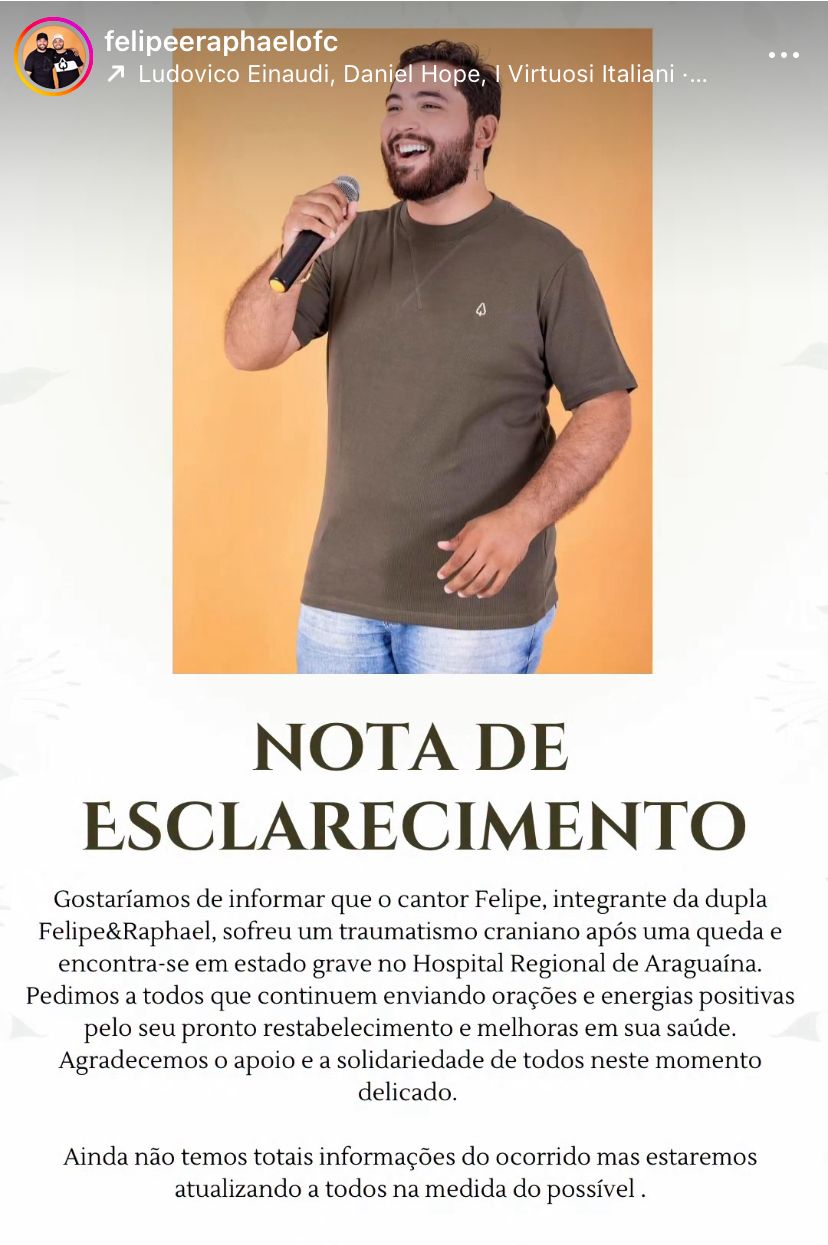 “Era pra ser mais um capítulo de um projeto lindo, cheio de sonhos, coragem e música”, diz trecho da nota, que também afirma que Felipe “agora está ao lado do Criador, no céu que ele tanto olhava com esperança”.