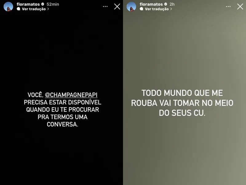 Mandou recado: irritada, Flora Matos voltou a falar sobre plágios em uma outra publicação “todo mundo que me rouba vai tomar no meio dos seus c*”, disparou a artista. Além das divas do pop internacional, ela também mencionou o rapper norte-americano Drake, quando insinuou que gostaria de ter uma conversa com o artista. “Você, @champagnepapi, precisa estar disponível quando eu te procurar pra termos uma conversa”.