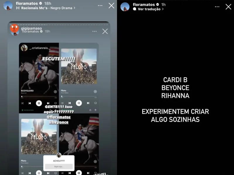 Entenda: tudo começou quando a brasileira repostou uma publicação no story do Instagram, que comparou o flow da música “BODYGUARD” de Beyoncé, ao de “Piloto”. Na sequência, Flora publicou algumas respostas de seguidores às comparações entre as canções. Em um outro story, ela escreveu “experimentem criar algo sozinhas”, aconselhando não só Beyoncé como também as divas Rihanna e Cardi B.
