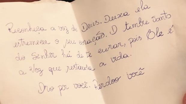 "Reconheça a voz de Deus. Deixa ela estremecer o seu coração. O timbre santo do Senhor há de te curar, pois Ele é a voz que restaura a vida. Oro por você. Perdoo você", diz o bilhete lido pelo agressor no vídeo.