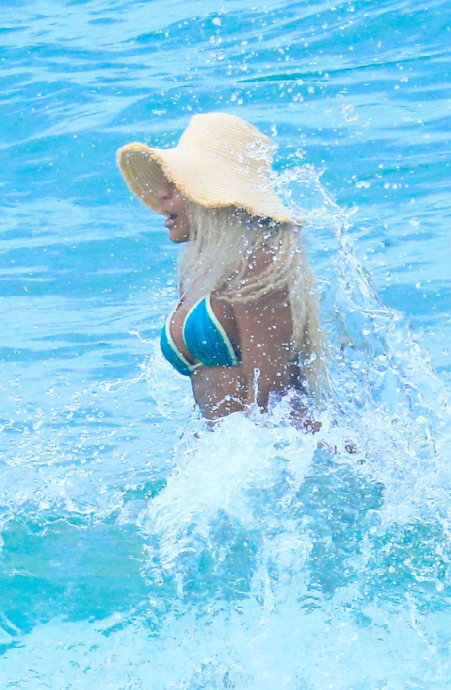 Ao entrar no mar, Cariúcha acabou levando um caldo, mas não perdeu o bom humor e riu da situação enquanto se levantava. O momento descontraído chamou atenção dos paparazzis de plantão.