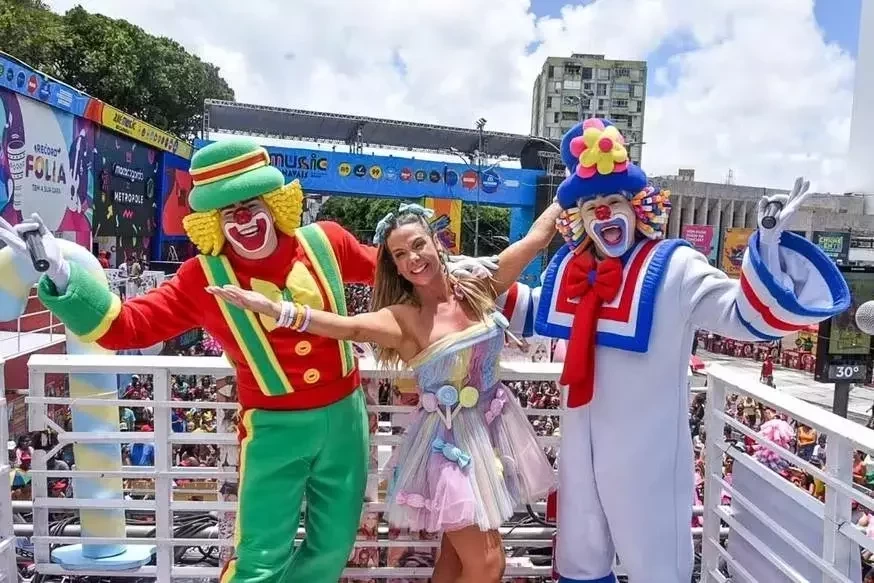 Para o figurino, a artista escolheu um look em candy colors, inspirado em doces. Para a festa ficar completa, Carla contou com a participação especial do marido Xanddy, e da dupla de palhaços Patati Patatá. O casal trocou beijos apaixonados durante o percurso.