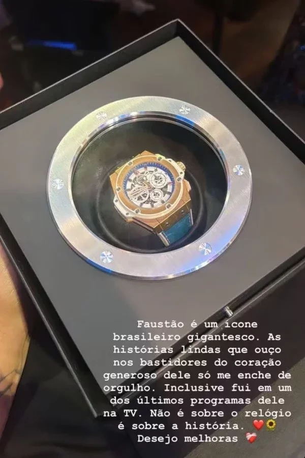 "Faustão é um ícone brasileiro gigantesco. As histórias lindas que ouço nos bastidores do coração generoso dele só me enche de orgulho. Inclusive fui em um dos últimos programas dele na TV. Não é sobre o relógio, é sobre a história. Desejo melhoras", disse o influenciador para João Silva, filho do apresentador.