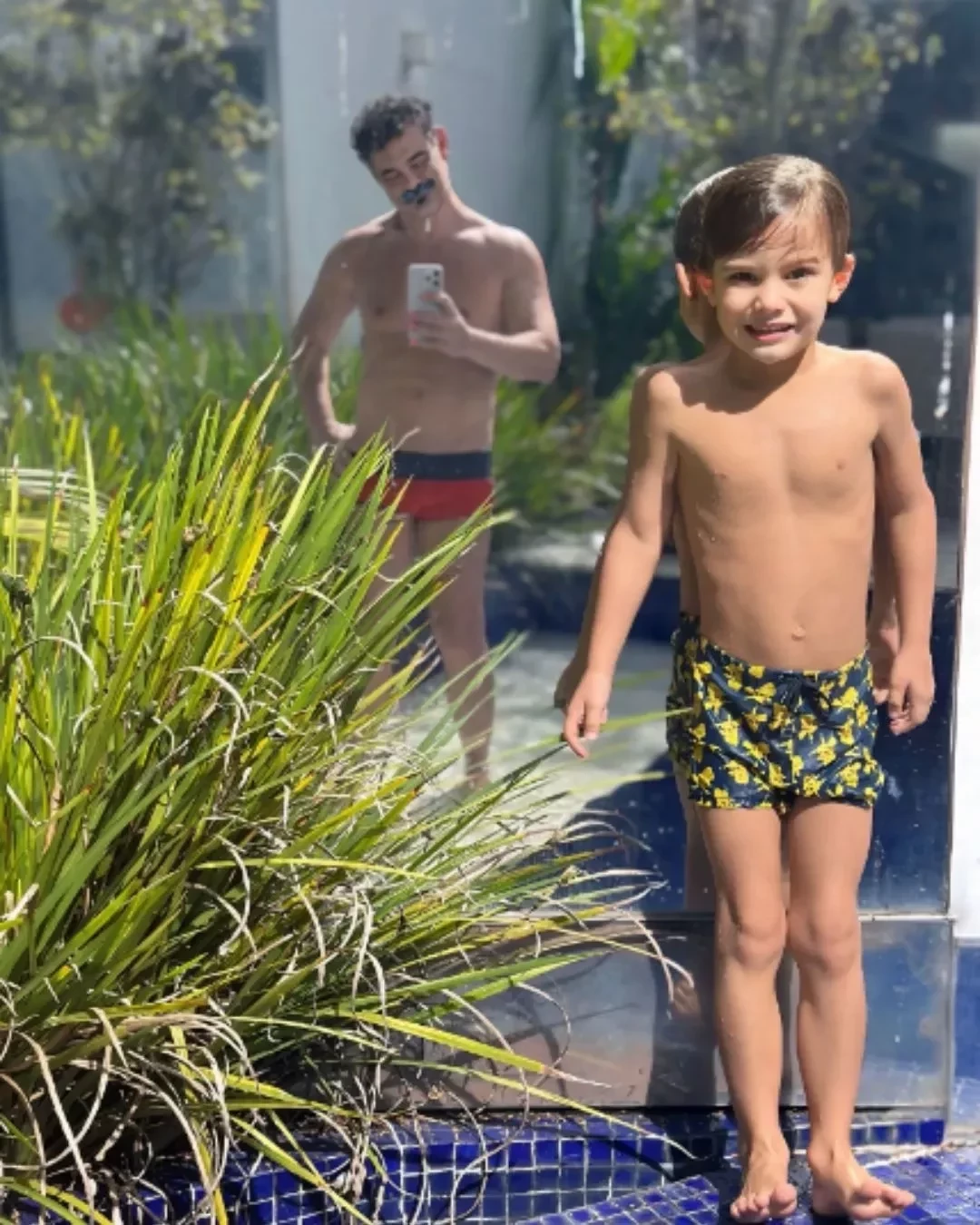 Na foto, o artista surge registrando o garoto enquanto ele toma banho de piscina. "Meu príncipe está crescendo."