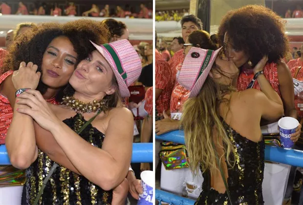 Carolina Dieckmann desfilou pela Mangueira na madrugada deste domingo (10) no Desfile das Campeãs e surpreendeu Tais Araújo com um selinho, quando a atriz passava pelo Camarote QUEM O Globo.