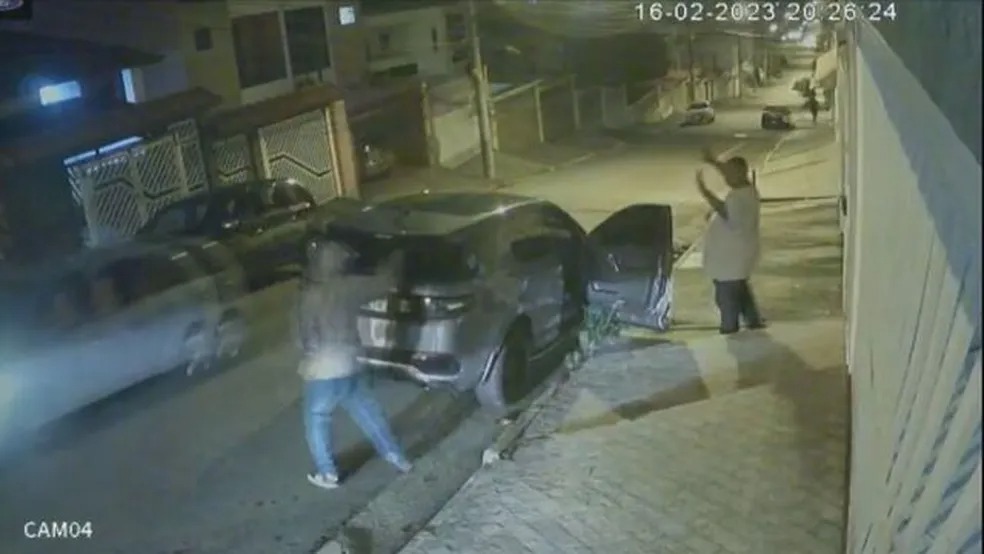 Em seguida, o assaltante entra na Land Rover e sai com o carro. Logo depois, um Fiat Uno branco, onde está outro criminoso armado, dá cobertura para o comparsa. E os dois veículos fogem.