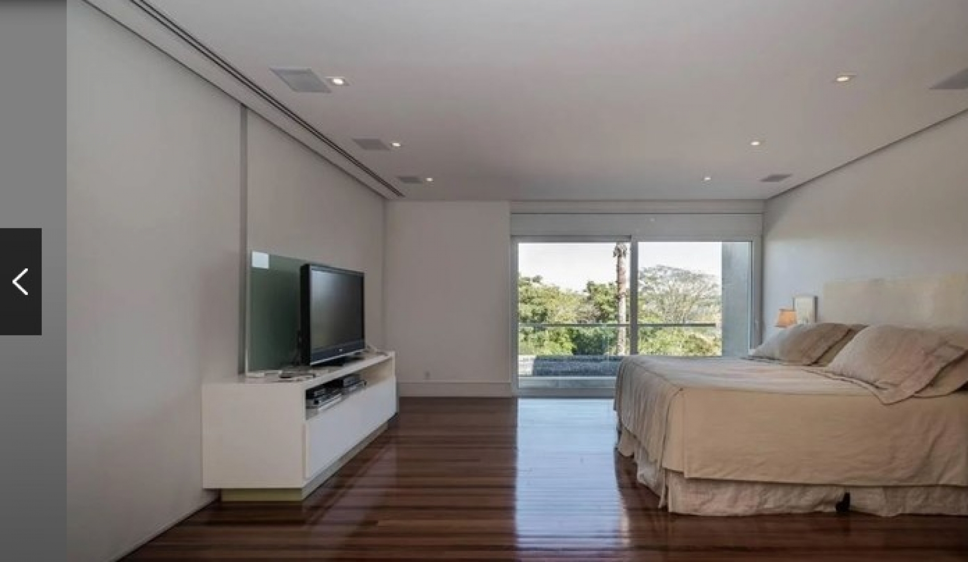O anúncio do site Imovelweb diz o seguinte: Hall de entrada com pé direito duplo, sala de estar com 2 ambientes, sala de jantar, home theather, lavabo, sala íntima com TV. São 8 suítes, sendo a suíte principal com closet e 2 banheiros (Sr. e Sra.), rouparia, cozinha gourmet, ampla varanda com 4 ambientes mais churrasqueira e forno de pizza, piscina, jacuzzi, sauna úmida, salão de jogos, quadra de tênis, mini campo de futebol gramado, playground, residência para caseiros, suíte para babás, mini horta, canil.