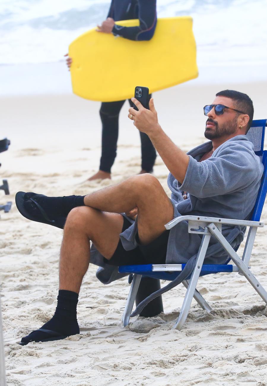 Mesmo com o mau tempo, as gravações de Vale Tudo seguiram firmes nas praias do Rio de Janeiro. Nesta segunda-feira (11), sob chuva, Bella Campos e Cauã Reymond estiveram na zona Sul para interpretar os personagens de Maria de Fátima e César. Nos bastidores, o ator se protegeu do frio com um roupão.