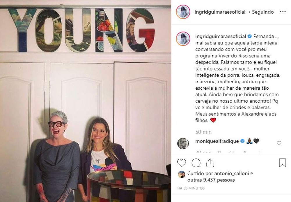 "Destemida, inteligente, falava de tudo. Uma humanista, uma mulher de coerência e clareza fundamentais nos dias de hoje. A perda é gigante! Sentimos muito do lado de cá. Um beijo carinhoso da minha família para as crianças e pro Alexandre."