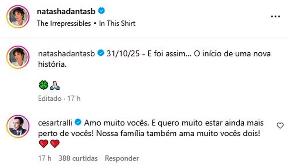 César Tralli fez uma declaração emocionante a William Bonner e Natasha Dantas após a despedida do jornalista do Jornal Nacional, na última sexta-feira (31). Natasha compartilhou nas redes sociais registros do momento marcante.“31/10/25 - E foi assim… O início de uma nova história”, escreveu.