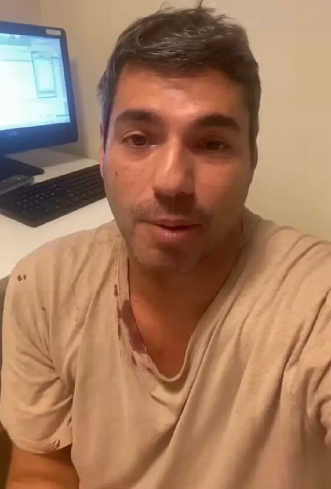 Chef Felipe Bronze com a gola suja de sangue após assalto/ Foto: instagram