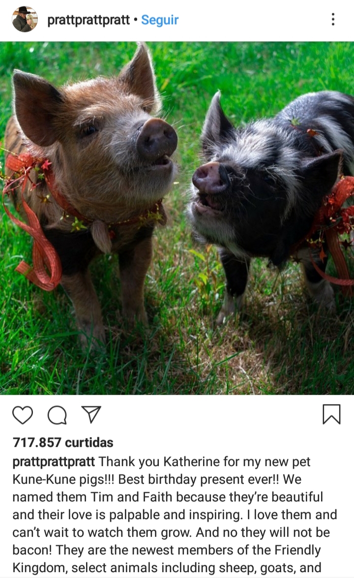 Katherine Schwarzenegger decidiu inovar no presente de aniversário, para o maridão Chris Pratt. Por meio de seu perfil oficial no Instagram, o próprio famoso ator compartilhou uma foto dos bichinhos de estimação que ganhou, da esposa: os porquinhos Tim e Faith.