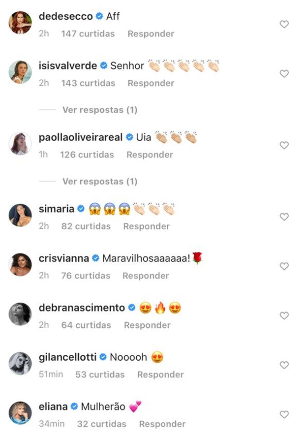 Amigas famosas da atriz também deixaram seus comentários, enchendo Claudia de elogios. Bruna Marquezine, Taís Araújo, Giovanna Ewbank, Paolla Oliveira, Deborah Secco, Isis Valverde e Cris Vianna foram apenas algumas que babaram pelo clique.