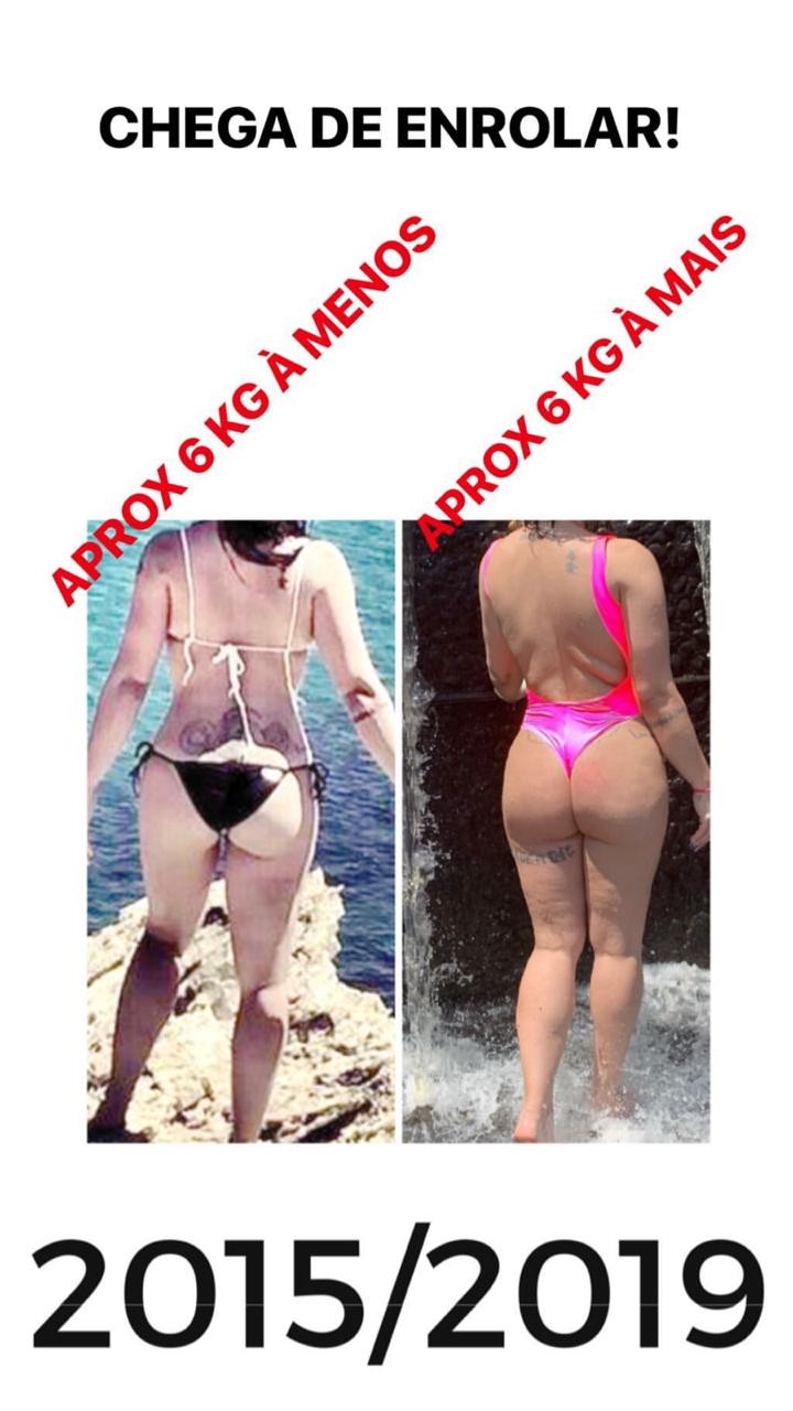 "Acho que menti no post", escreveu, "não sei se eu estava 10kg mais magra não, talvez uns 6kg mais magra... Fato é que eu gosto muito mais da minha bunda como ela tá hoje, mas eu gostava mais do meu contorno antes, mais fininho."