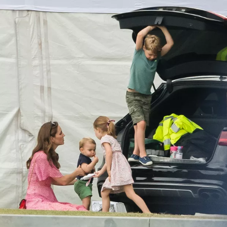 Kate, que usava um vestido cor-de-rosa e alpargatas, segurava Louis de 1 ano em seus braços. Mais tarde, ele brincou na grama com sua mãe, enquanto George, que faz 6 anos em 22 de julho, e Charlotte, de 4 anos, brincavam nas proximidades do Billingbear Polo Club em Berkshire.