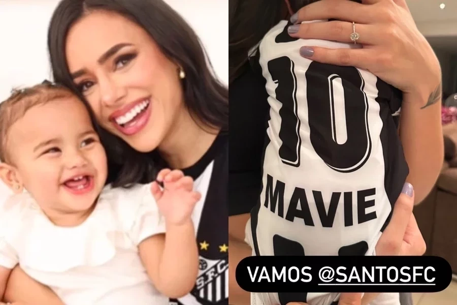 Nesta sexta-feira (31) o Santos Futebol Clube compartilhou um registro especial de Neymar, Bruna Biancardi e Mavie, todos vestindo o uniforme do Peixe. A imagem destacou a barriguinha de grávida de Bruna, que espera sua segunda filha com o jogador. "Família", legendou o clube, celebrando o momento.