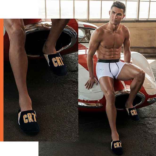 Cristiano Ronaldo é o garoto-propaganda da própria marca de roupas. Por esse motivo, ele mesmo exibiu os modelitos de cueca que pôs à venda. Nas fotos, o craque vestiu o modelito Men Bamboo, que custa 29,95 euros, o equivalente a cerca de 136 reais. Em outro clique, CR7 calça um chinelo com as suas iniciais. O produto está à venda por 15 euros, o mesmo que 72 reais.
