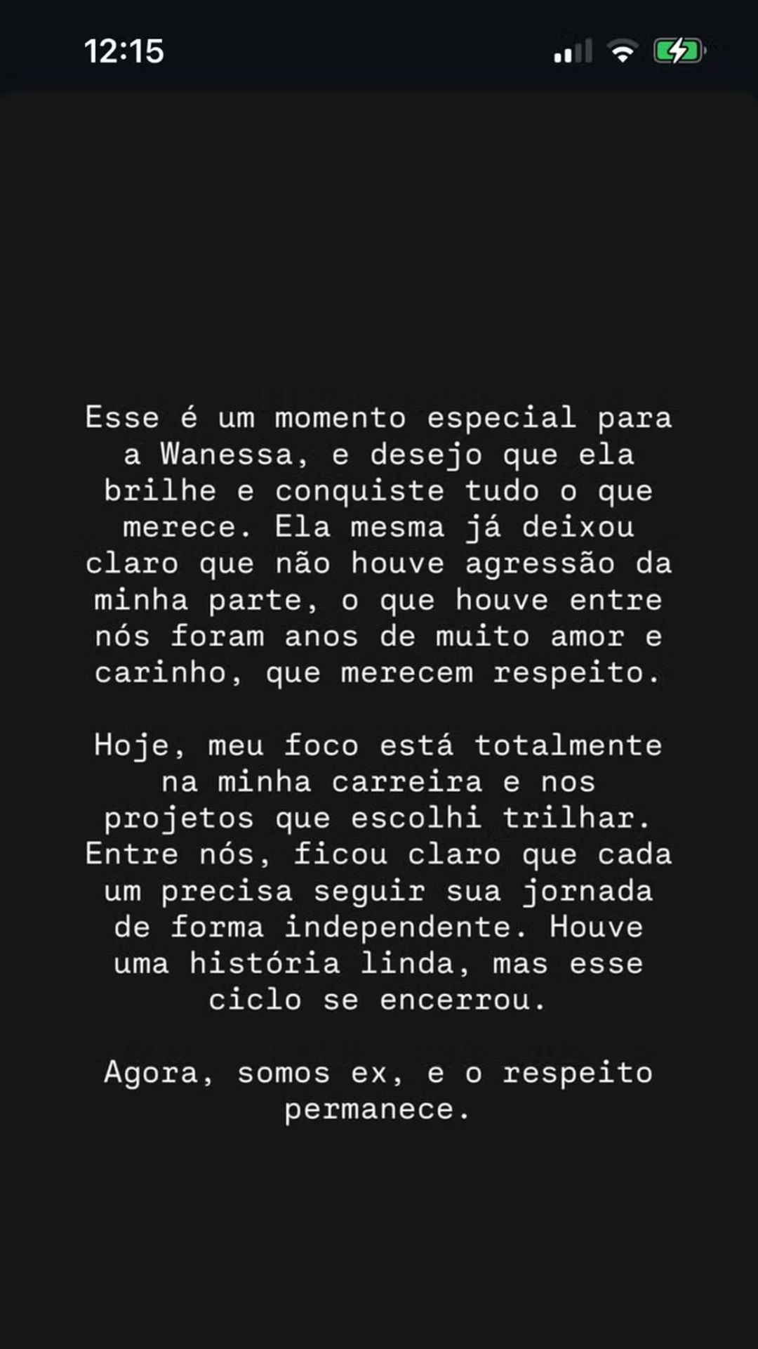 O ator também destacou estar voltado para seus próximos projetos. “Hoje, meu foco está totalmente na minha carreira e nos projetos que escolhi trilhar”, escreveu. Segundo ele, a relação terminou em comum acordo, mas com o respeito preservado.