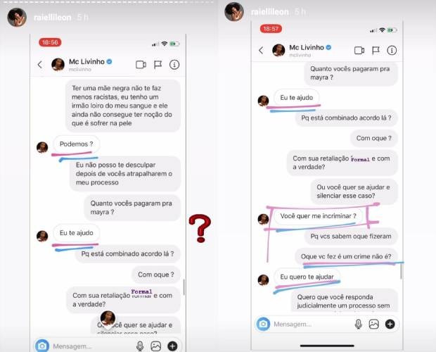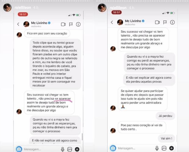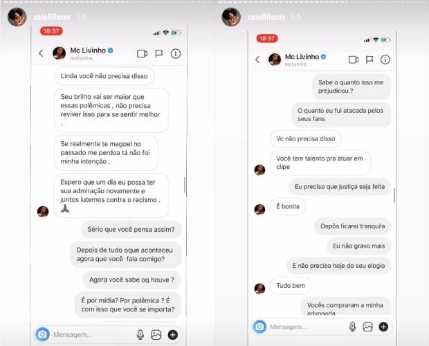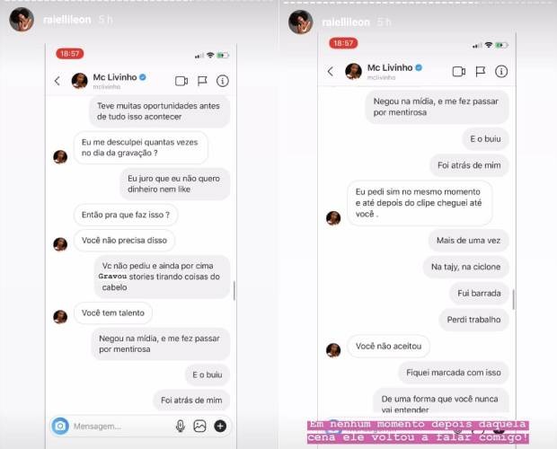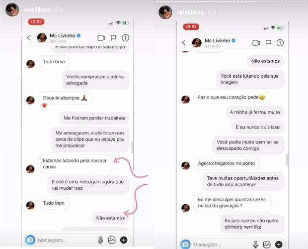 Nos prints, é possível ver que Livinho pede desculpas, mas também diz que Raielli está querendo aparecer e que ela não precisa disso, pois tem brilho e talento. A dançarina responde, falando que o funkeiro comprou a advogada dela, a ameaçou e ela perdeu muitos trabalhos, além de que ele não se importa de verdade.